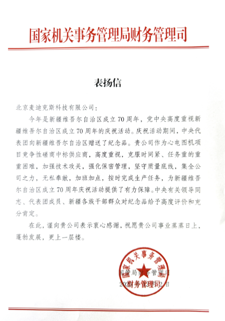 2025年12月2日,北京麦迪克斯科技有限公司收到国家机关事务管理局财务管理司发来的《表扬信》,为在新疆维吾尔自治区成立70周年庆祝活动中,按时、保质、保量提供1700台心电图机纪念品的工作给予肯定。在这举国同庆、全国人民共同欢庆的重要时刻,能够为党中央以及新疆各族干部群众提供坚实有力的保障,为提升边疆地区基层医疗水平贡献了一份专业力量,麦迪克斯深感荣幸。