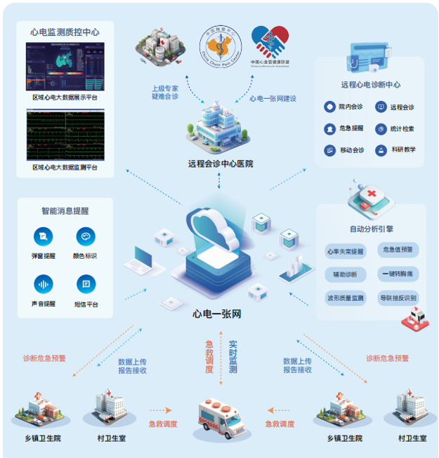 麦迪克斯“心电一张网”解决方案,正是针对极端天气下心梗救治痛点的破局之举。作为连接基层医疗机构与上级心电诊断中心的“数字化桥梁”,它构建起全流程、高效率的协同救治体系,彻底打破地域、天气与时间的壁垒。